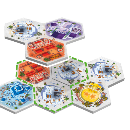 - Выложить плитку в свой город. Каждый накрытый карьер приносит игроку один жетон камня. На первом уровне города плитку кварталов необходимо размещать так, чтобы она граничила по крайней мере с одним краем другой плитки, тогда как для построения второго и выше уровней игрок должен разместить плитку поверх трех гексов из как минимум двух разных плиток.