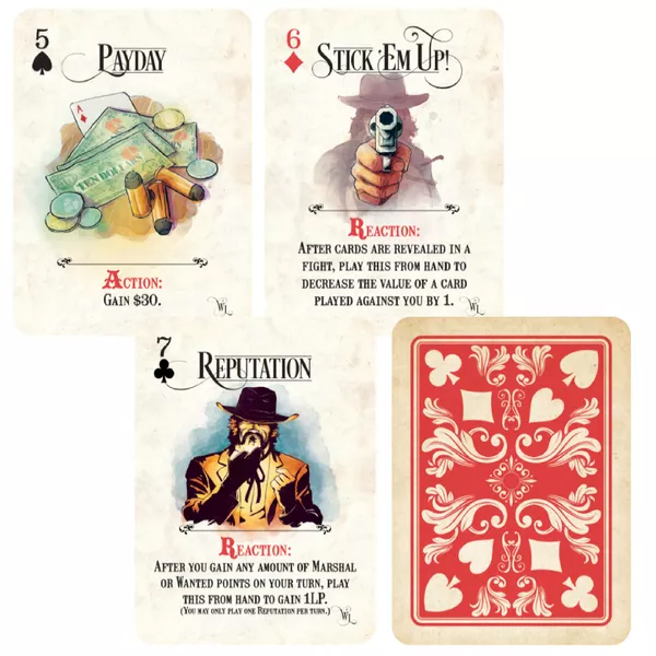 – Действие локации. В магазине можно купить/улучшить карты предметов, в салуне сыграть в покер, а в кабинете врача залечить раны. В салуни можно спустить деньги и заработать очки легенды, на ранчо купить скот (перегон скота дает очки маршала, а похищение – очки преступника), в шахте попытаться добыть золото, бросив игральные кости старого. В банке можно продать самородки и заработать очки легенды. Также преступник может совершить ограбление банка;