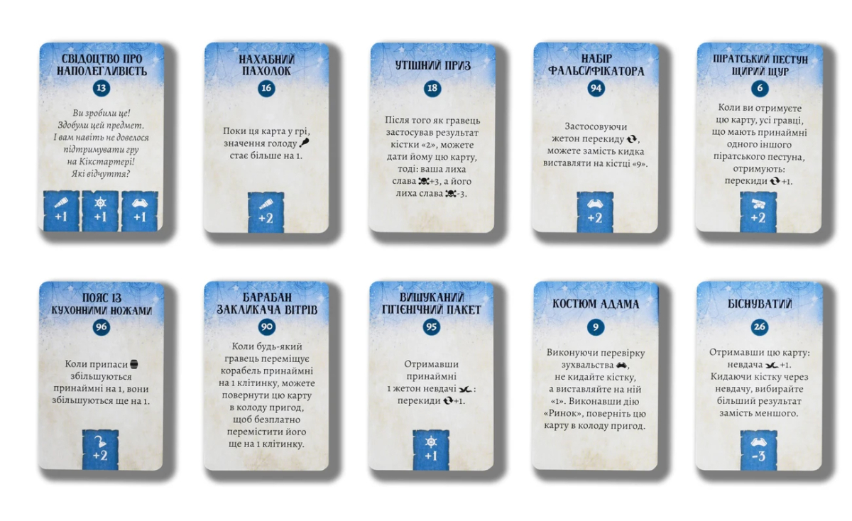 Также от игроков могут потребовать изменить уровень опасности, улучшить / ухудшить показатели корабля или переместить фигурку корабля. Разведывая новые места, игрок открывает и размещает на карте плитки навигации. Канонир может улучшить пушку.