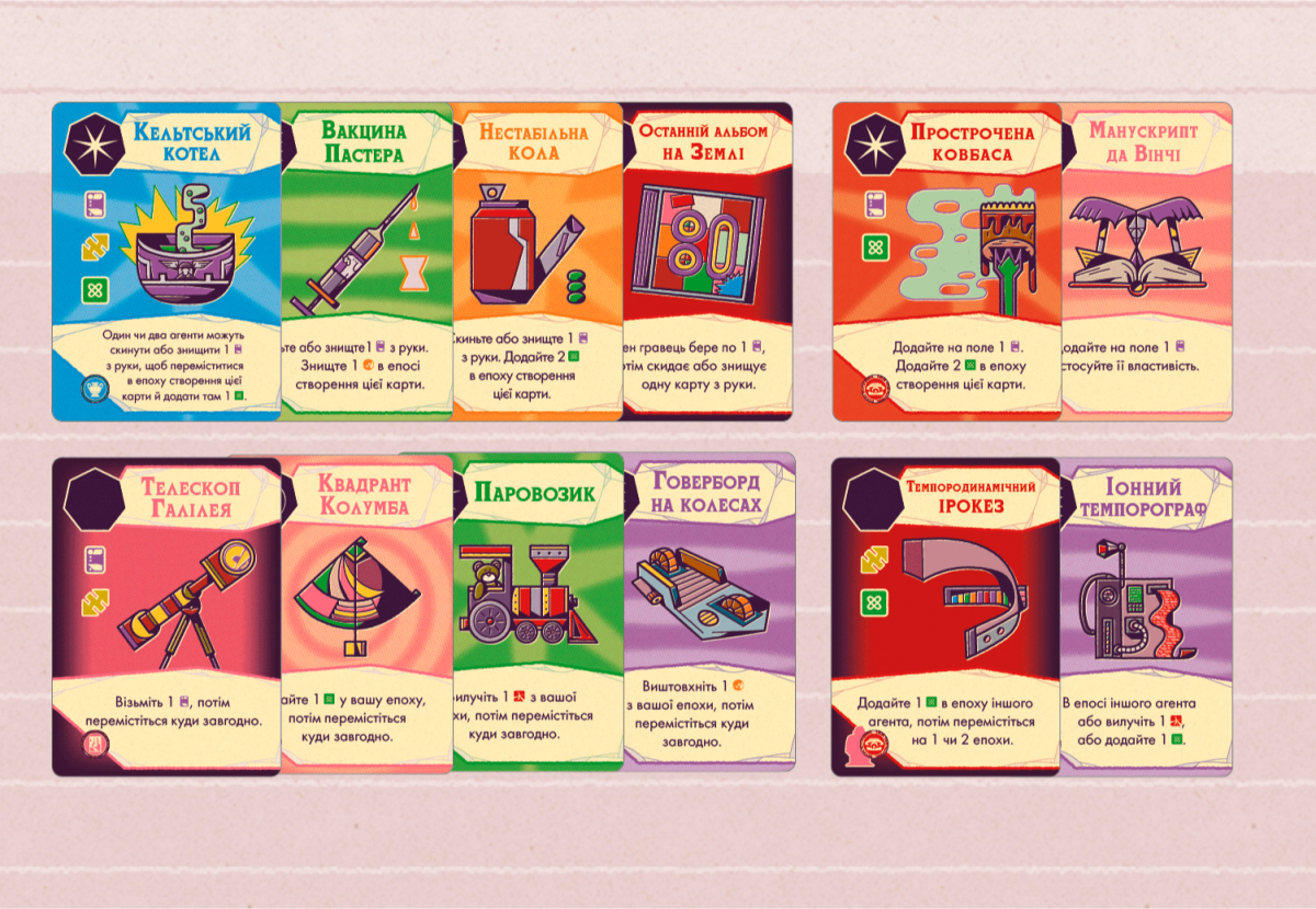 – Создать ПЕТЛЮ. Игрок тратит кубик энергии в своей эпохе и поворачивает вертикально (подготавливает) карты одного выбранного измерения. Создание каждой следующей петли в этом ходу стоит на 1 энергию больше.