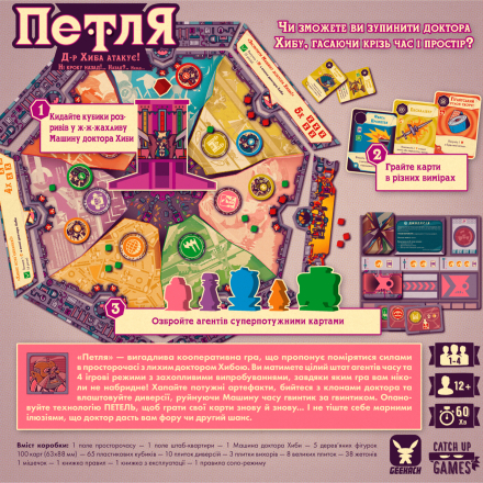 В начале партии каждый из участников выбирает своего агента с уникальной колодой артефактов и собственной манерой борьбы со злобными гениями. В вашем распоряжении будет только три часовых цикла, в течение которых вам нужно будет заархивировать 4 плитки диверсии и любой ценой воспрепятствовать образованию вихрей!