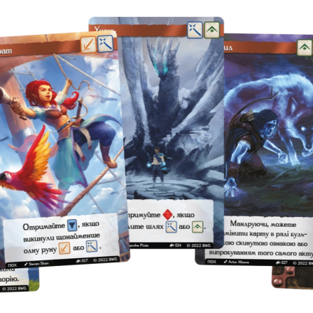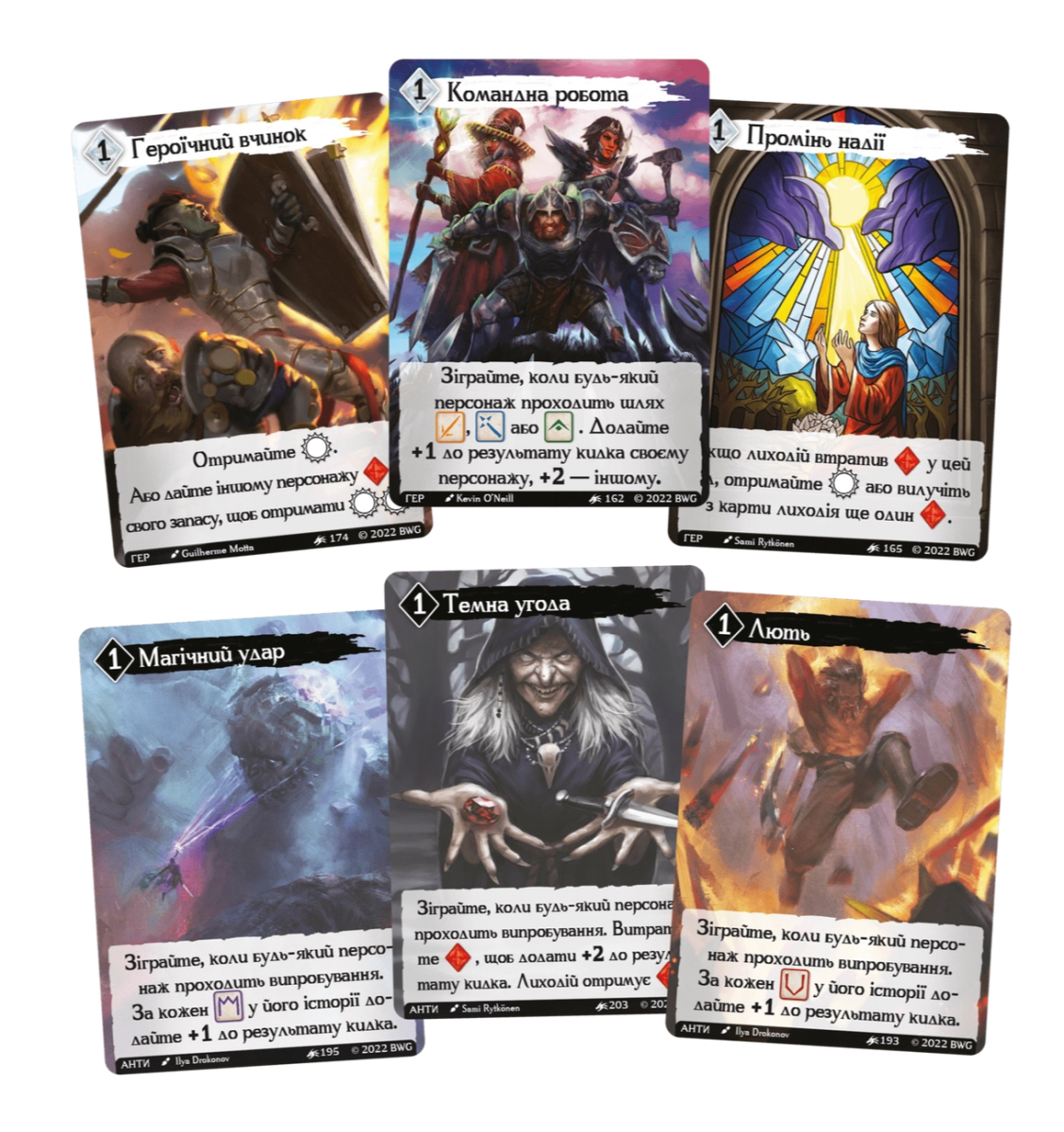- применить эффекты карты персонажа. Эффекты карт наследия применяют, когда выпадает руна «героя / антигероя» при прохождении испытания. Эффекты карт происхождения приносят жетоны опыта. Карты класса обладают постоянными эффектами, если выложить на них нужное количество жетонов опыта.