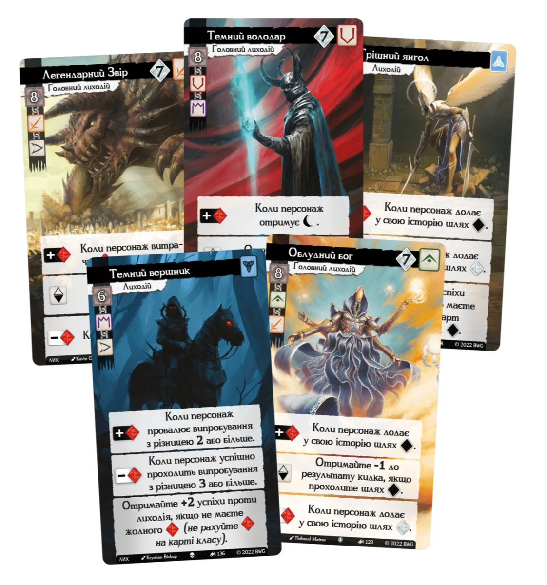 В ходе игры злодей будет мешать игрокам одержать победу. Каждый раз когда игрок выбрасывает руну «героя / антигероя», злодей разыгрывает карту проклятия. Бросив вызов злодею, игрок проходит карту испытания «Злодей». Когда все игроки бросят вызов злодею, карта переворачивается стороной «Главный злодей». «Главного злодея» проходят в акте ІІІ так же, как и «Злодея». Одолев «Главного злодея», игроки суммируют очки судьбы.