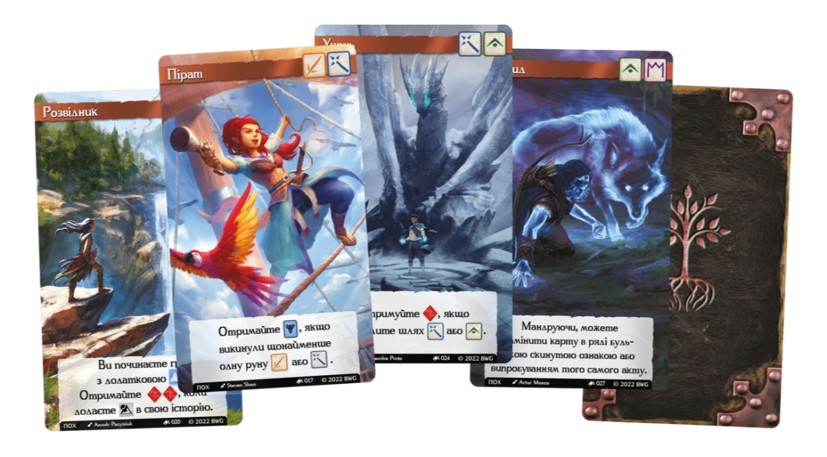 В начале партии каждый игрок выбирает четыре карты персонажа: наследие, происхождение, класс и судьбу. Эти карты станут основой сюжета, создаваемого на планшете персонажа. Игроки размещают под картами персонажей карты истории с добытыми очками и символами умений. Умения усилят персонажа перед лицом новых испытаний.