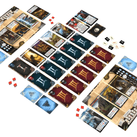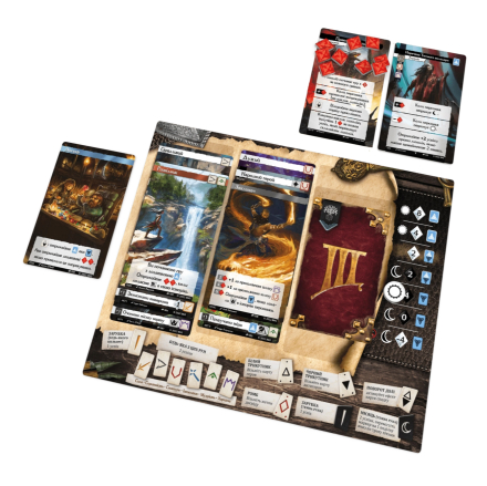 - Испытание. При прохождении испытания игрок смотрит на базовую сложность испытания и выбирает путь (верхний или нижний, который повышает сложность испытания на 1). Затем игрок берет доступные руны: три основные руны + изображенные на карте испытания руны умений, если у него есть соответствующие символы в истории персонажа. Бросив руны, игрок применяет эффекты и определяет результат, суммируя выпавшие успехи на рунах и бонусы от эффектов карт. Если полученный результат больше или равен сложности испытания, игрок успешно проходит испытание и размещает карту испытания под картой персонажа соответствующего акта на своем планшете.