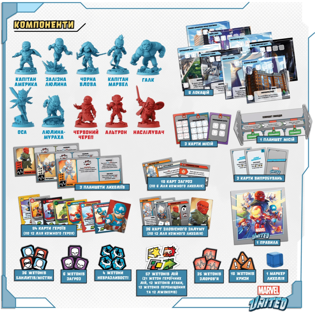 В игре «Марвел Юнайтед» участники смогут сыграть за таких известных супергероев, как Халк, Железный человек, Капитан Америка, Капитан Марвел, Черная вдова, Оса и Человек-муравей. Собрав команду мечты, они бросят вызов одному из суперзлодеев – Красному Черепу, Альтрону или Подражателю (также известному как Таскмастер).