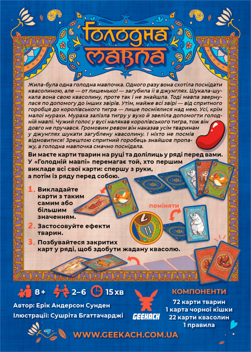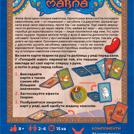 Эта игра о том, как одна обезьянка захотела позавтракать, но потеряла фасоль в джунглях. К счастью, другие звери – маленький муравей, ловкий воробей, королевский тигр и другие – помогли обезьяне найти пропажу. Опытные игроки могут сыграть турнирный вариант из четырех партий, получая карты фасоли в награду. В конце турнира побеждает игрок с наибольшим количеством фасолин на картах.