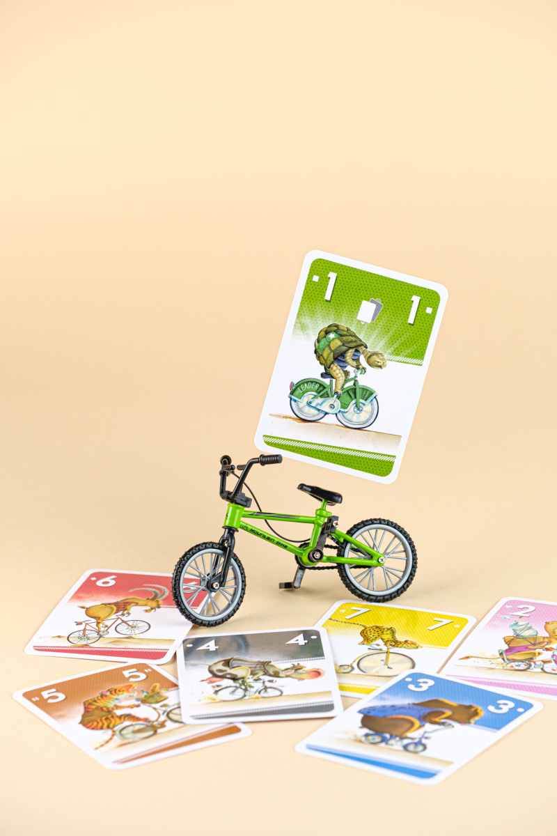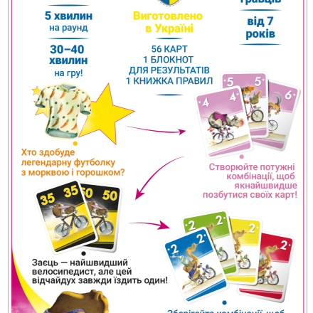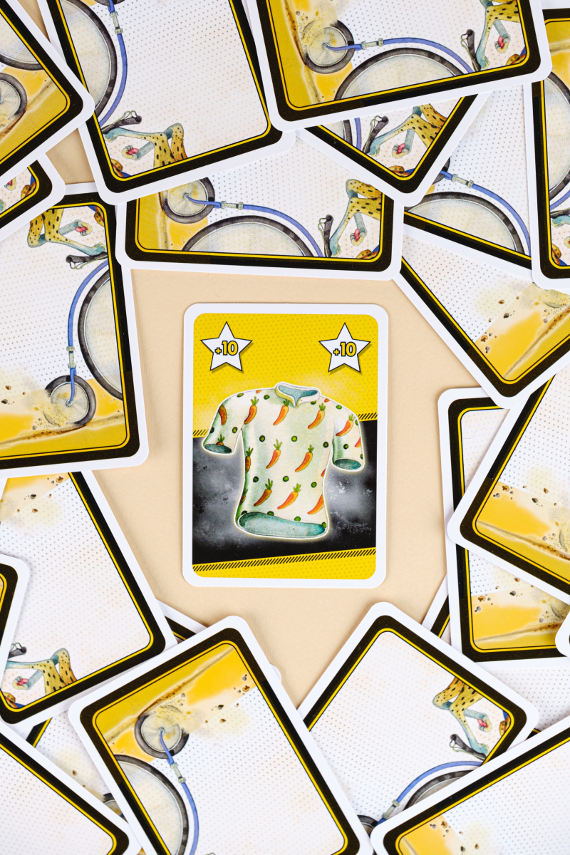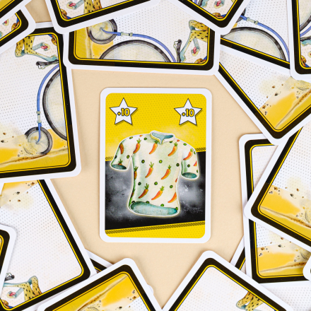 Выигрывайте этапы велогонки, чтобы получить максимальное количество очков и легендарную футболку с морковью и горошком! Игра длится 5 раундов. Каждый раунд – это этап велогонки по горной трассе с финишем на вершине. Чтобы выиграть раунд, вам нужно избавиться от всех своих карт быстрее других игроков.