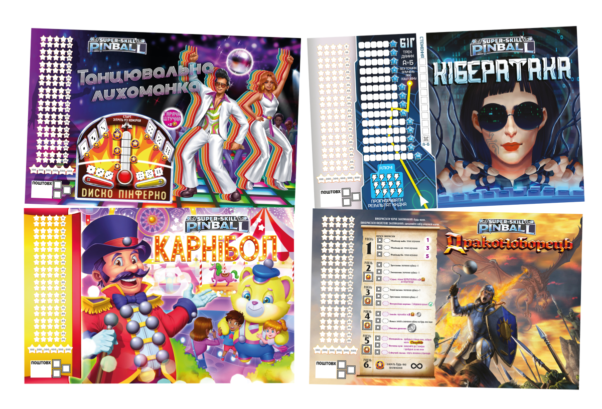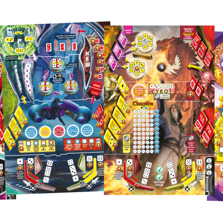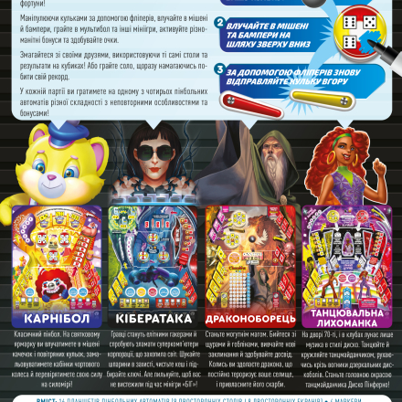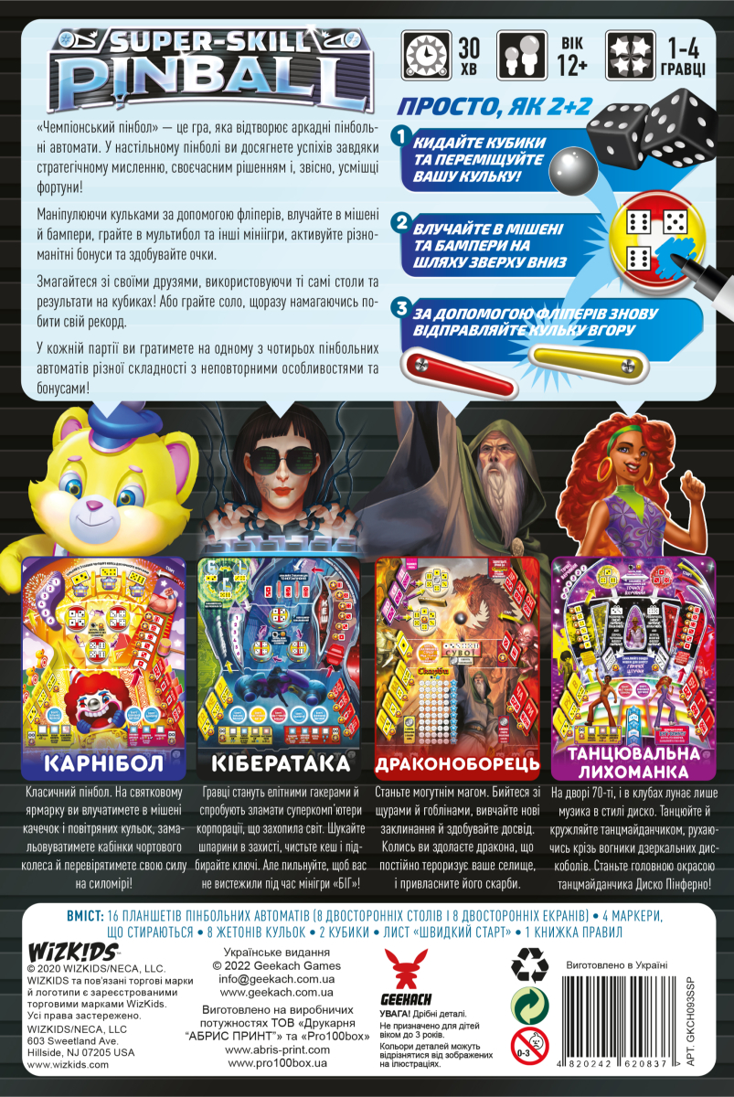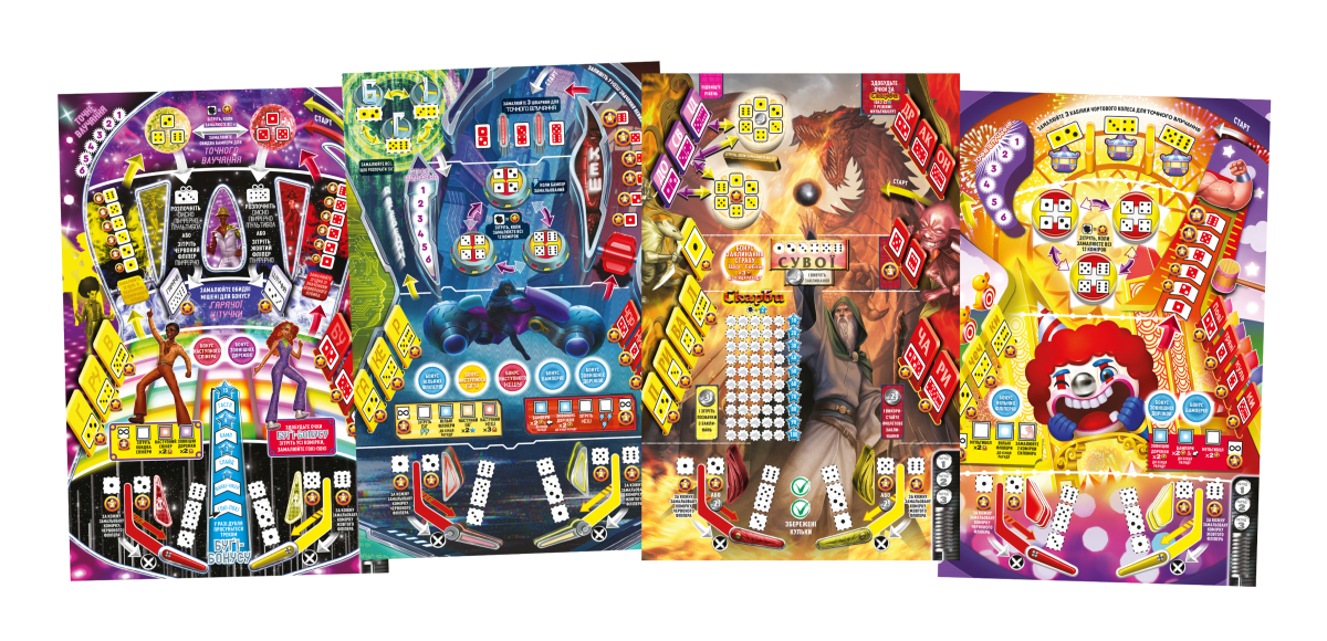 В настольной игре «Super-Skill Pinball: 4-Cade» в каждый ход на стол бросают два кубика. Каждый игрок выбирает кубик, чтобы с его помощью переместить свой жетон шарика и попасть в одну из ячеек. Затем он набирает очки и активирует бонусы. Как только все игроки переместят свои шарики, начинается новый ход.