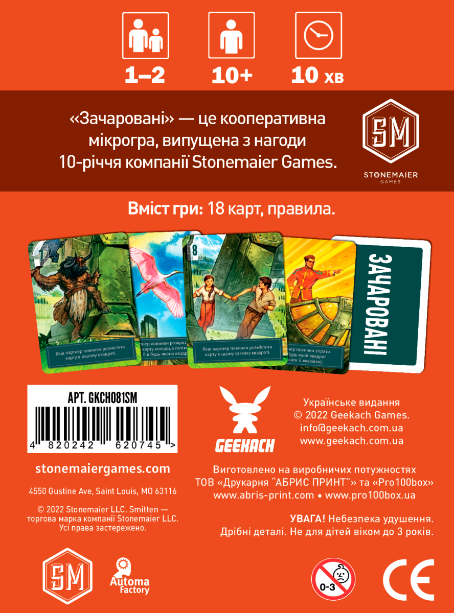 Цель этой абстрактной игры – выложить 2 одинаковых квадрата 3 на 3 карты в каждом. В начале игры все 18 карт перетасовывают. 1 случайную карту откладывают в сторону. Каждый игрок берет из колоды определенное количество карт на руку (3 или 4 карты, в зависимости от уровня сложности).