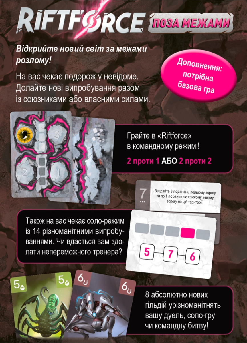 Откройте новый мир вне разлома! Вас ждет путешествие в неведомое. Преодолевайте новые испытания вместе с союзниками или собственными силами. Дополнение «Riftforce. За пределами» позволяет играть в командном режиме или соло, а 8 совершенно новых гильдий повысят вариативность и увеличат количество победных стратегий.