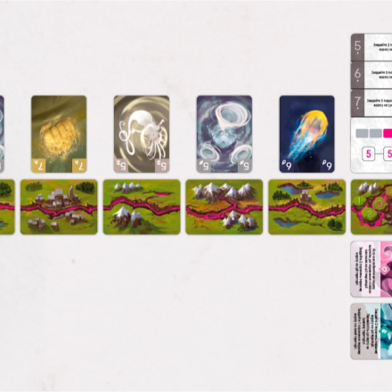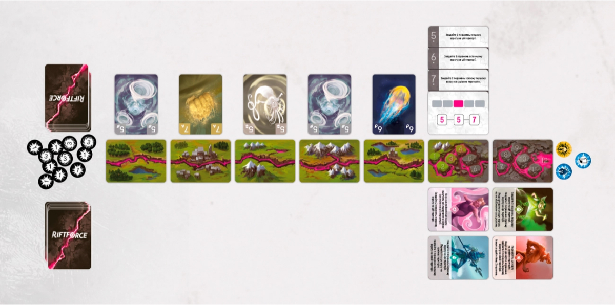 Как обычно, игрок выполняет 1 действие. Затем разыгрывает верхний план из стопки. На каждой карте отмечена 1 территория. Напротив этой территории нужно выложить карту элементаля из колоды тренера.