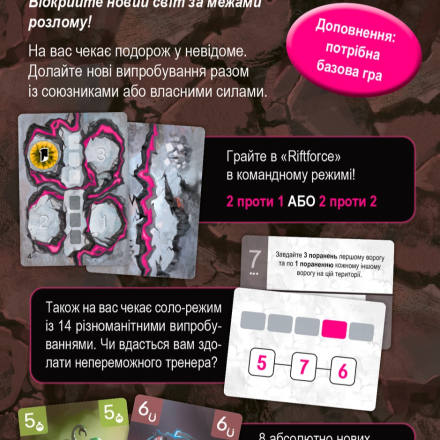 «Riftforce: Beyond» – великолепное дополнение для игры «Riftforce. Сила разлома». Содержит карты 8 новых гильдий, карты серых территорий, очередности ходов для командной игры, карты испытаний для соло игры, карты планов захвата и планов атаки. Если вы хотите разнообразить базовую игру, испробовать новые тактики и механики, советуем купить данное дополнение.