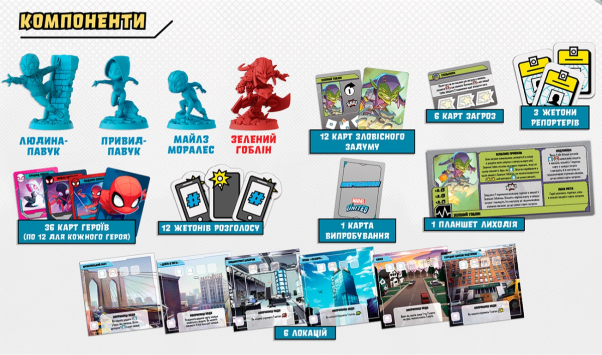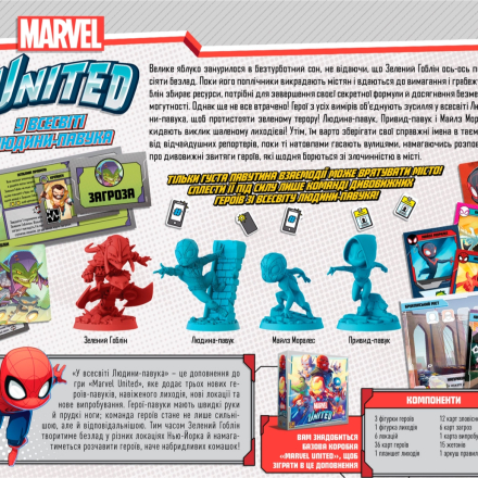 «Marvel United: Enter the Spider-Verse» - дополнение для семейного кооператива «Marvel United». Содержит фигурки трех новых супергероев (Человек-паук, Призрак-паук и Майлз Моралес) и фигурку злодея (Зеленый Гоблин), новые локации, карты героев, испытаний, угроз, зловещего замысла, планшет злодея и различные жетоны.