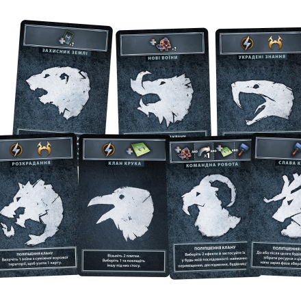 – Улучшить. Игрок выбирает карту на своей руке и размещает ее в активной зоне, не применяя ее эффекта, ИЛИ удаляет ее из игры. После этого он тратит 3 знания, чтобы получить улучшение. Выбрав одну из карт улучшений своего клана, игрок берет ее на руку. Теперь он может играть эту карту.