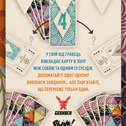 Игроки получают очки, выполняя условия на картах заданий с помощью обычных карт разных цветов и значений. Сыграв все карты, игроки начинают подсчет очков. Ваш итоговый результат – сумма очков в зоне слева умноженная на сумму очков в зоне справа.