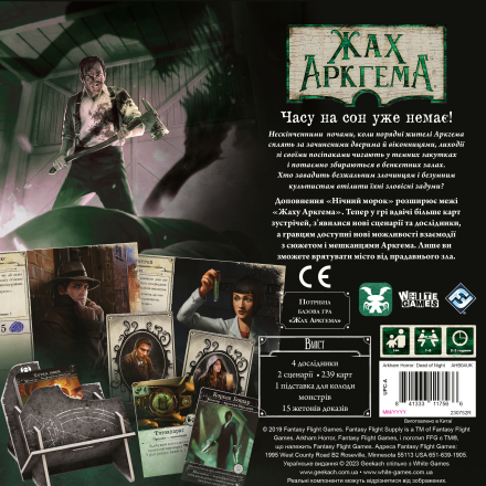«Arkham Horror (Third Edition): Dead of Night» - дополнение для кооперативной настольной игры «Ужас Аркхэма. Третья редакция». Игрокам предлагается два новых больших сценария («Выстрелы во тьме» и «Безмолвие Цатхоггуа»), которые они смогут пройти четырьмя новыми сыщиками.