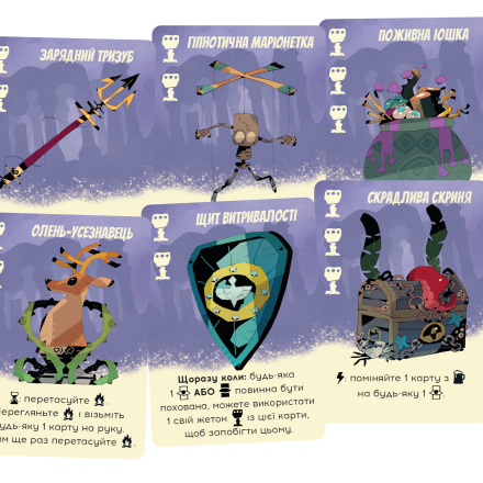 - Каждый жетон – это одна активация карты. Участники могут в свой ход сбросить один жетон с карты, чтобы активировать ее свойство.