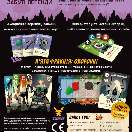 «Тайные лидеры. Забытые легенды»– это второе дополнение к игре «Hidden Leaders», содержащей сразу три совместимых между собой и с базовой игрой модули. Четверо забытых потомков императора сумели растолковать содержание легенд и найти таинственные артефакты. Однако сердца жителей Ошры заполонила скверна, и как знать, как новые лидеры справятся с этим!