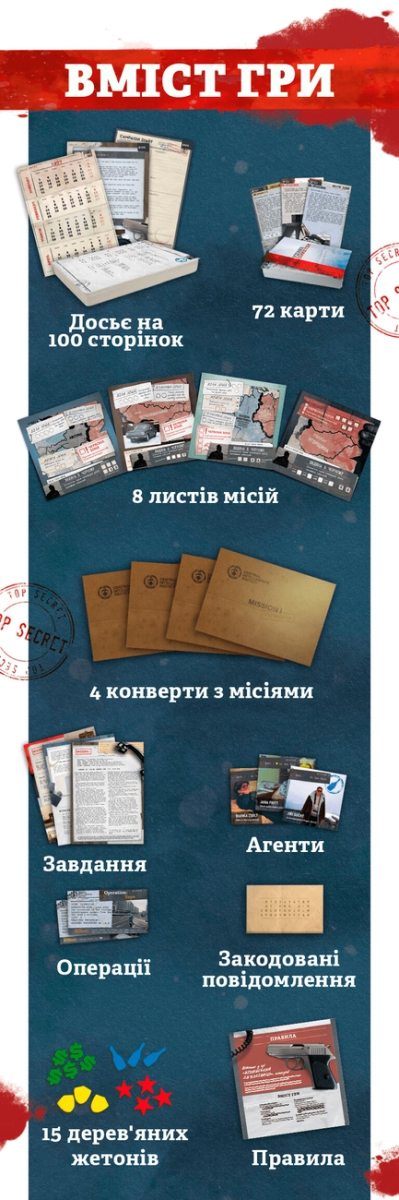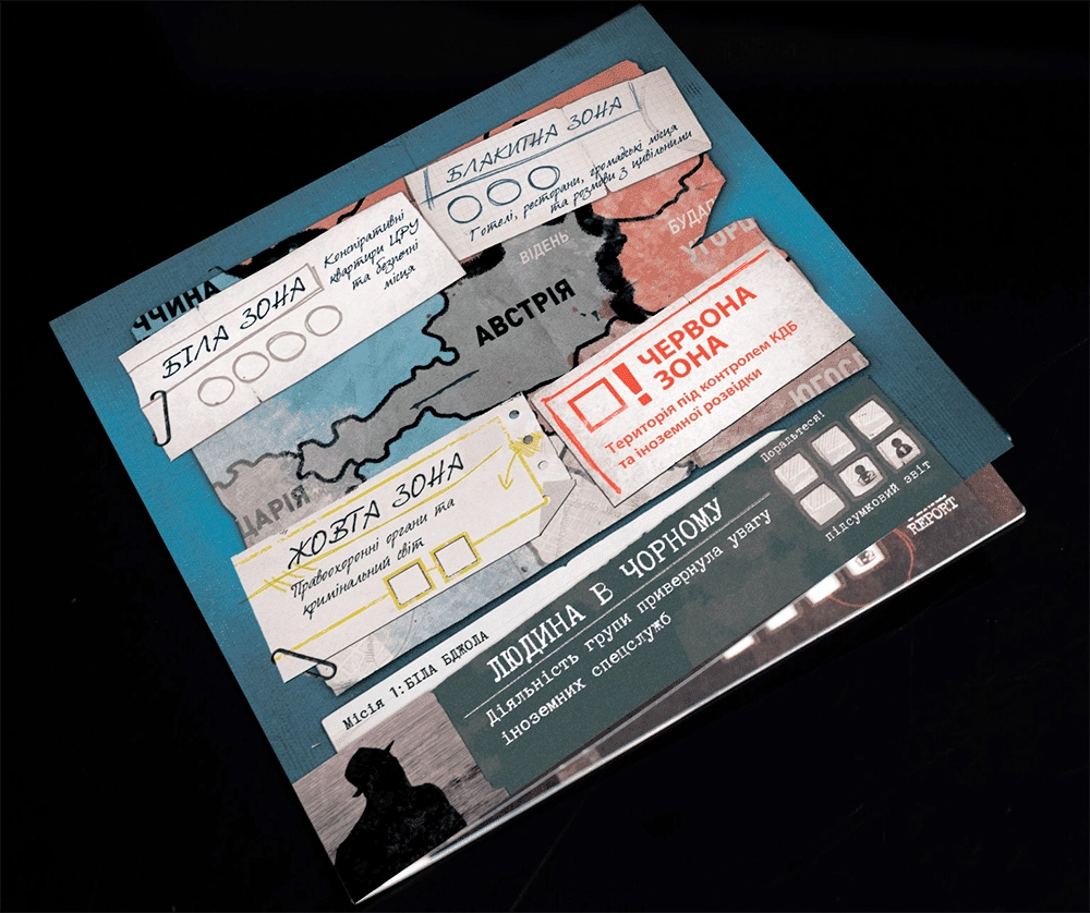 Карты зацепок отображают действия группы ОСО. На каждой карте указаны уровень разоблачения (насколько заметны действия группы для иностранных разведок) и зона. Белая зона – конспиративные квартиры, голубая – рестораны отели и прочие общественные места, желтая – полицейские или криминальные районы, красная – места под контролем иностранной разведки. Посещая зону, группа зачеркивает сколько клеток в ней, какой уровень разоблачения на карте зацепки. Если клетки заканчиваются, игроки зачеркивают клетки в секции Люди в черном.