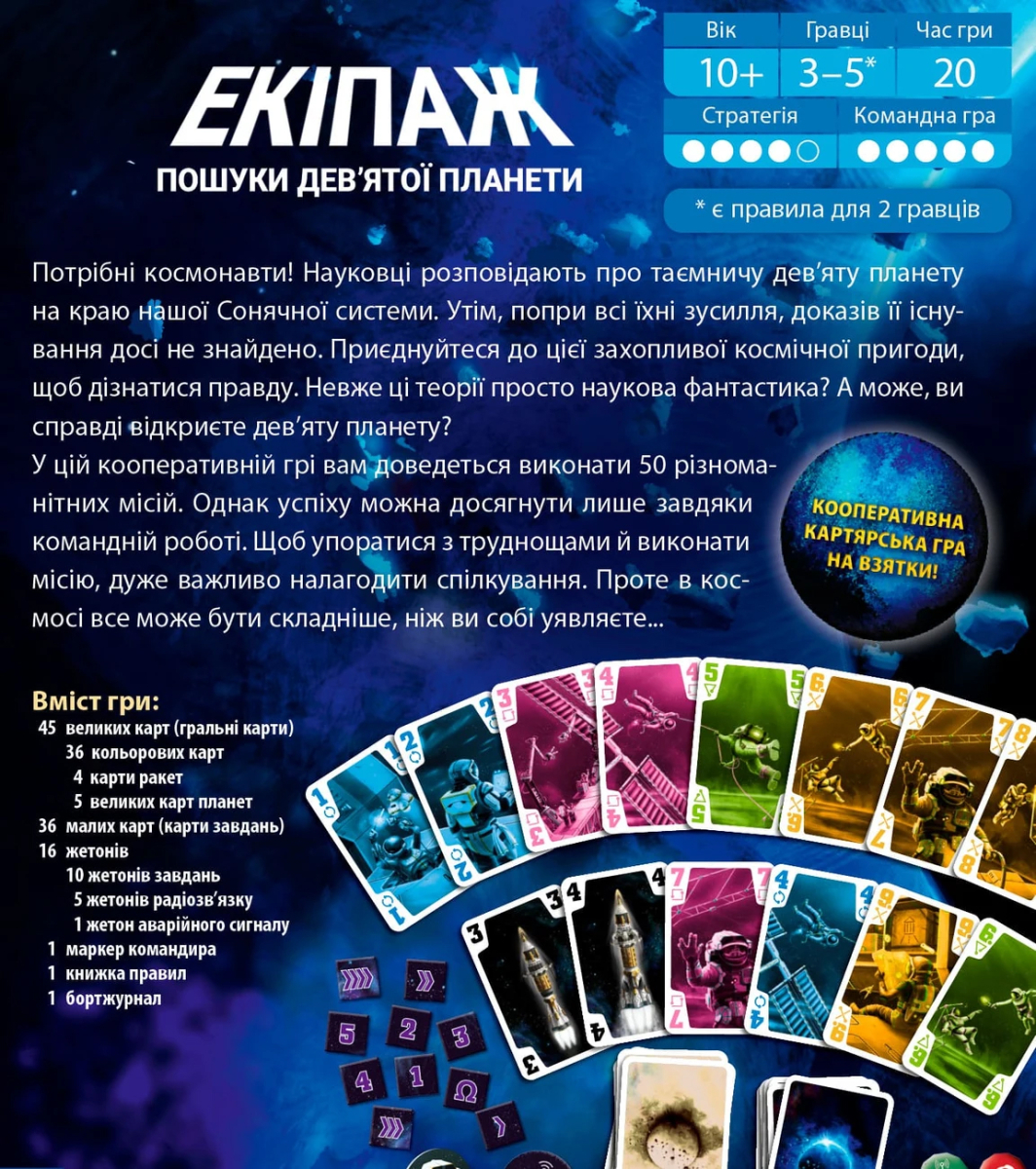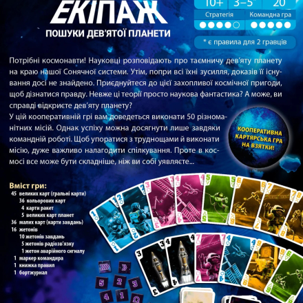 Экипаж: Поиски девятой планеты – кооперативная игра для сплоченной команды, для семьи или дружеской компании. Чтобы успешно пройти все миссии, игроки должны чувствовать, понимать логику и предугадывать действия партнеров. Игра налаживает обстановку, сближает участников и развивает навыки командной работы гораздо эффективнее, чем мероприятия тимбилдинга.