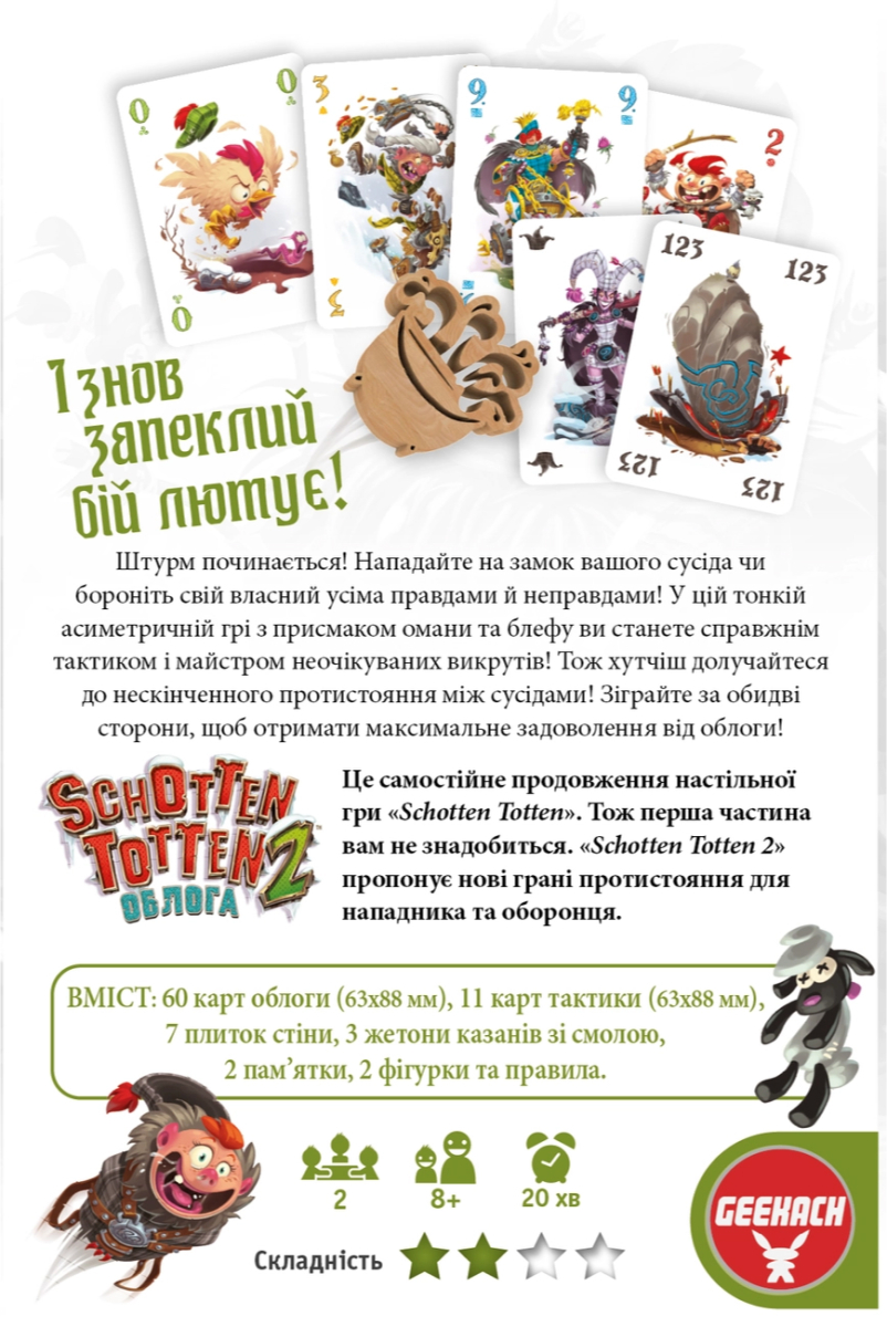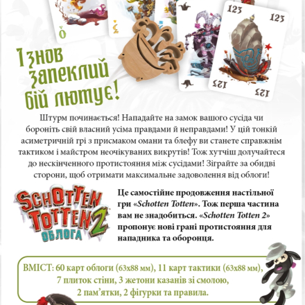 «Schotten Totten 2» - хитрый дуэльный филлер про осаду замка на составление карточных комбинаций («set collection») с элементами контроля территорий («area control»). Один игрок командует осадной армией, а его оппонент руководит обороной замка. У противников асимметричные цели и свои собственные победные условия.