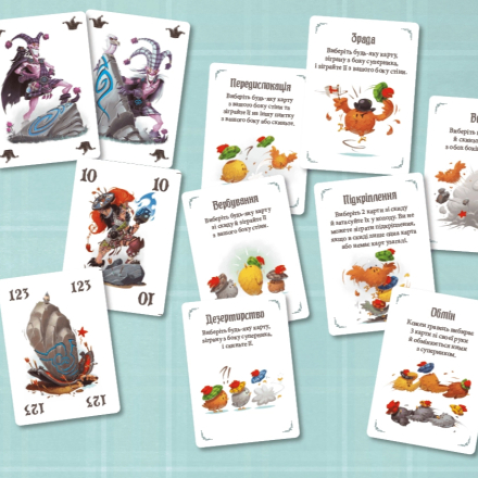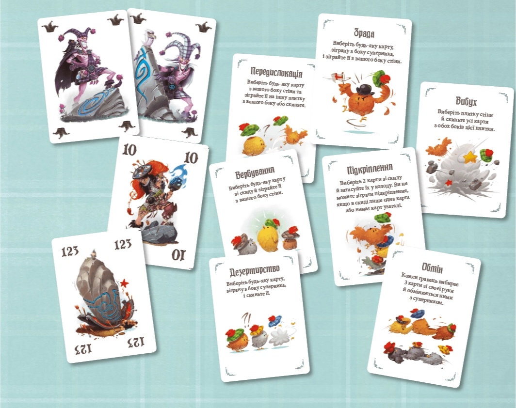 Карта с силой «0» выбивает карту «11» того же цвета на другой стороне стены, а карта «11», соответственно, «0» того же цвета.
