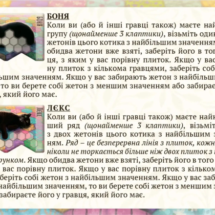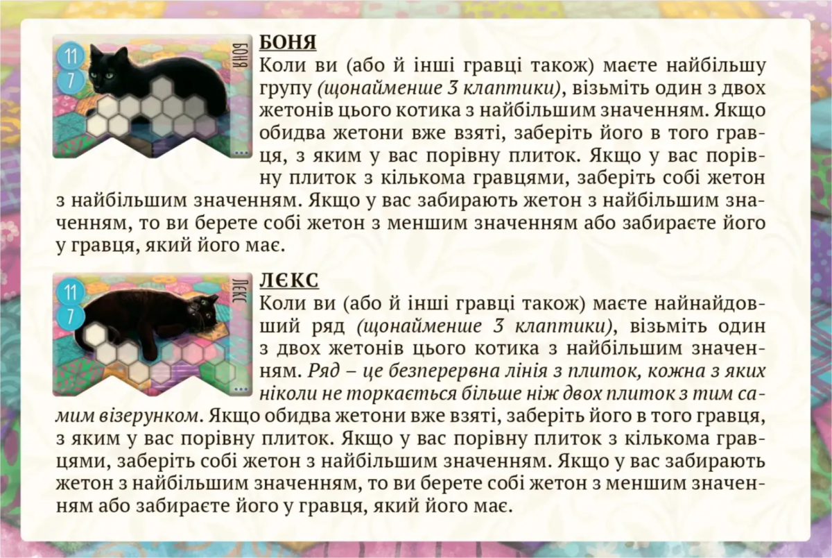 Двухсторонняя промо плитка с оценкой кошек и четыре дополнительных жетона кота, специальный набор из Kickstarter. Эти кошки добавляют варианты оценки "наибольшая группа узоров" и "длиннейшая линия узоров", что дает вам еще больше возможностей играть!