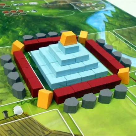 Перед началом партии игроки получают планшеты, рабочих своего цвета и стартовые монеты (первый игрок – 3 серебра, а каждый следующий на 1 больше). Еще нужно подрафтить карты сооружений: участники получают по четыре карты, выбирают по одной, передают карты по кругу, снова выбирают и т.д.