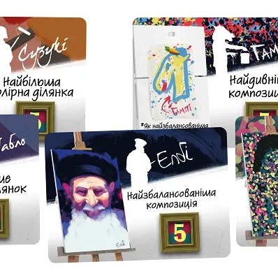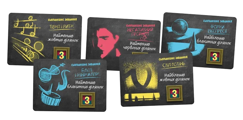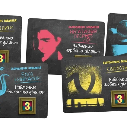 - Раунд 1 - это раунд Теории цвета. Выложите лицом вверх по одной карте цветных заданий из каждой колоды.