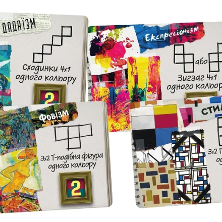 В карточной игре «Академия Искусств» двое или четверо участников соревнуются в составлении цветовых узоров из абстрактных карт на общем поле. Комбинируйте зоны трех контрастных цветов, чтобы заработать как можно больше победных очков и получить самую высокую оценку Профессора!