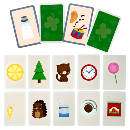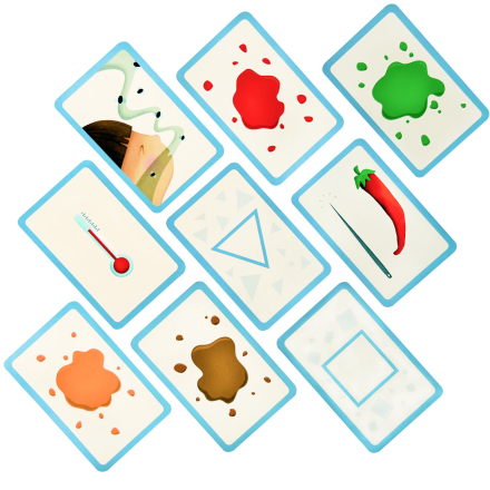 В наборе карточки с изображением предметов (кактус, носок, еж и т.п.) с одной стороны, и их признаков (круглый, горячий, острый и т.п.) - с другой. Каждый игрок получает по 5 случайных карт и выкладывает их перед собой стороной с объектами вверх. В центре стола размещается одна случайная карта стороной с признаком вверх – это активная карта.