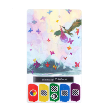 - Завершить картину. Игрок вставляет в протектор три выбранные прозрачные карты живописи и карту фона. Затем сравнивает видимые символы с условиями на картах победных очков. За каждое совпадение игрок получает соответствующую ленту из запаса.