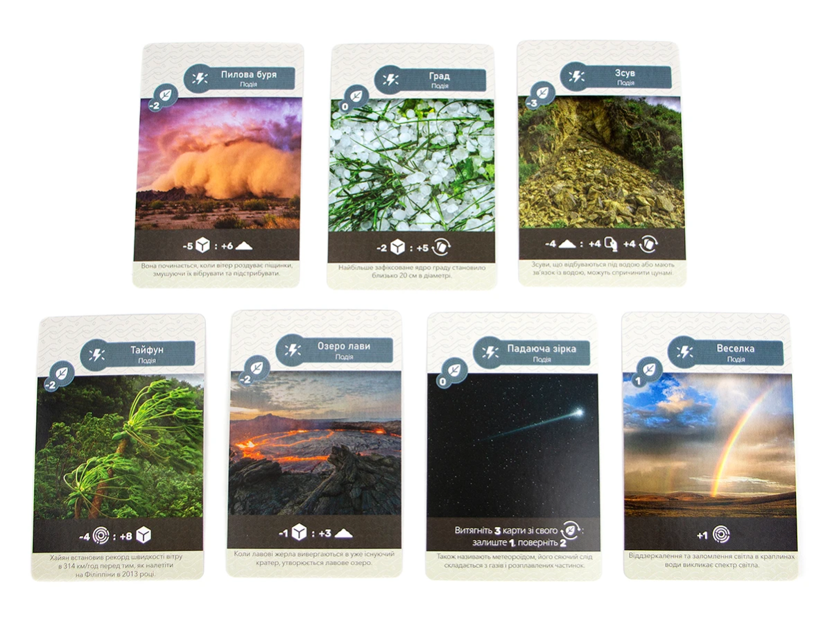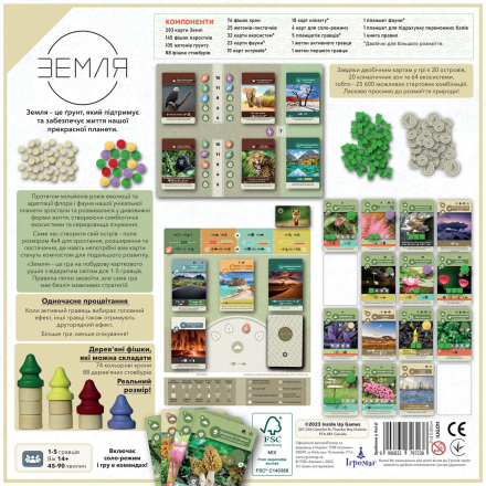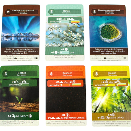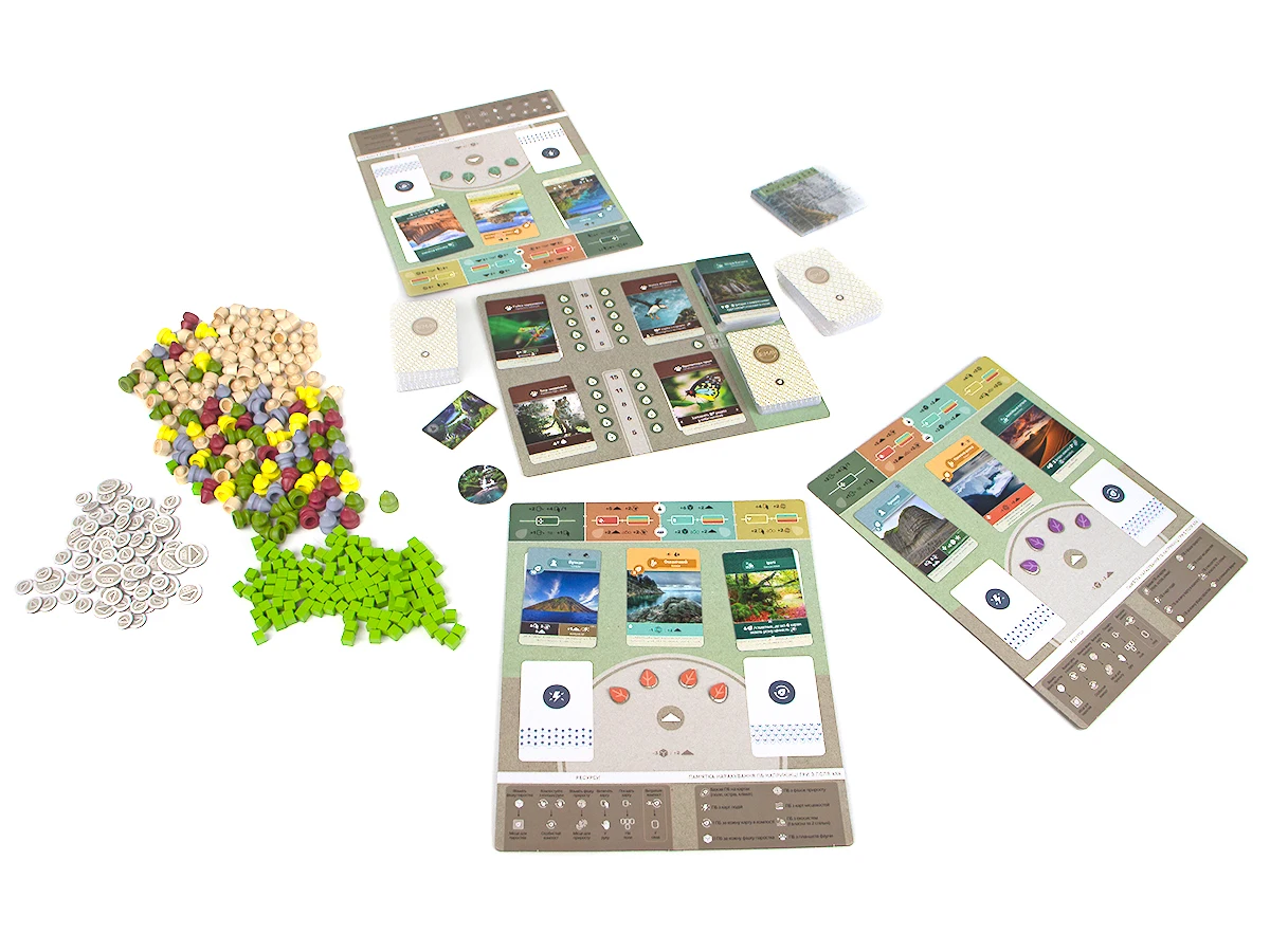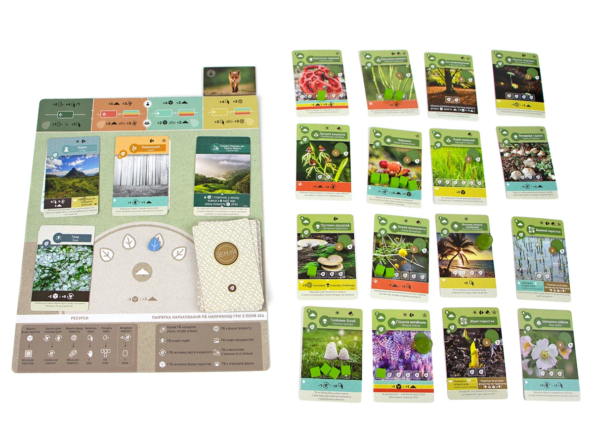 В начале партии каждый игрок получает карты острова, климата и экосистемы, определяющих стартовые ресурсы и цели на игру. Также игроки получают стартовые карты Земли и могут выбрать, какие из них оставить в руке, а какие – положить в зону компоста на своем планшете.