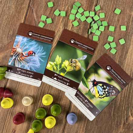 - Выращивание. Можно взять 4 карты из колоды Земли, затем разместить до двух фишек прироста на картах флоры. В то же время соперники могут либо взять 2 карты Земли, либо разместить до 2 фишек прироста. Напоследок, все игроки активируют желтые и разноцветные свойства карт.