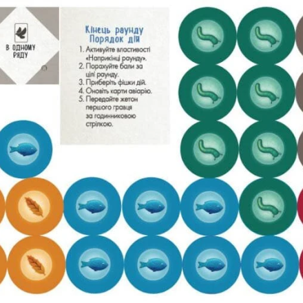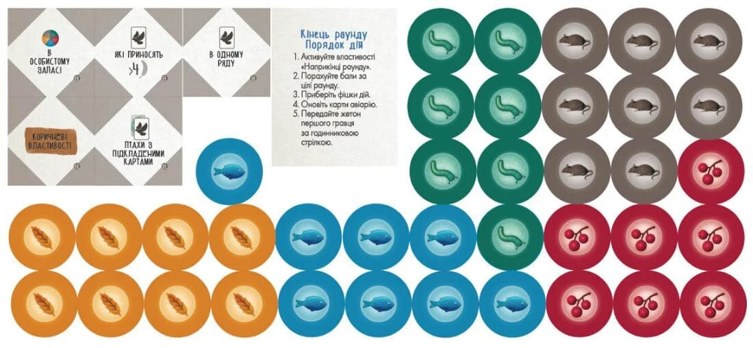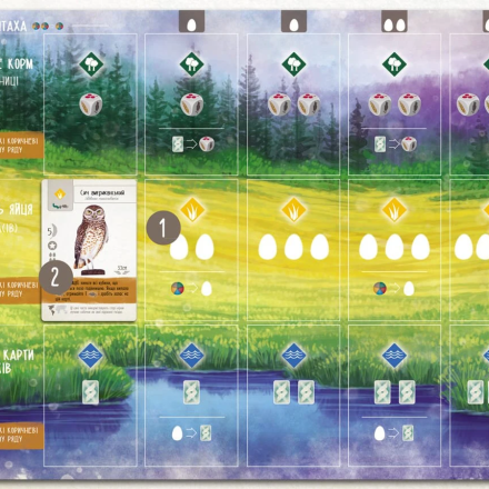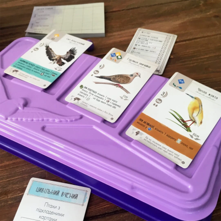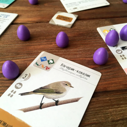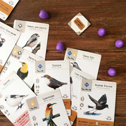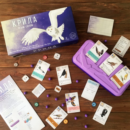 В комплекте более восьмидесяти карт новых птиц, карты бонусов, автомы, дополнительные жетоны корма, новые цели раундов, фигурки фиолетовых яиц, блокнот для подсчета очков и авиарий с крышкой для хранения увеличивающейся коллекции пернатых.