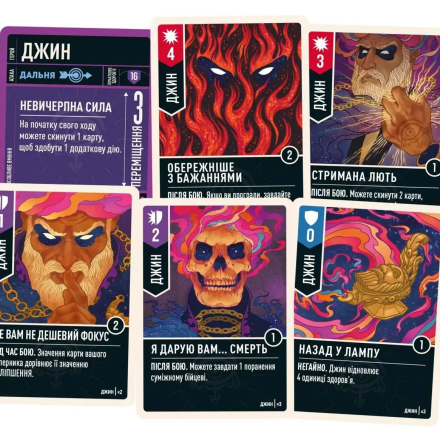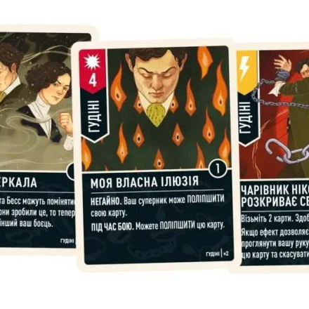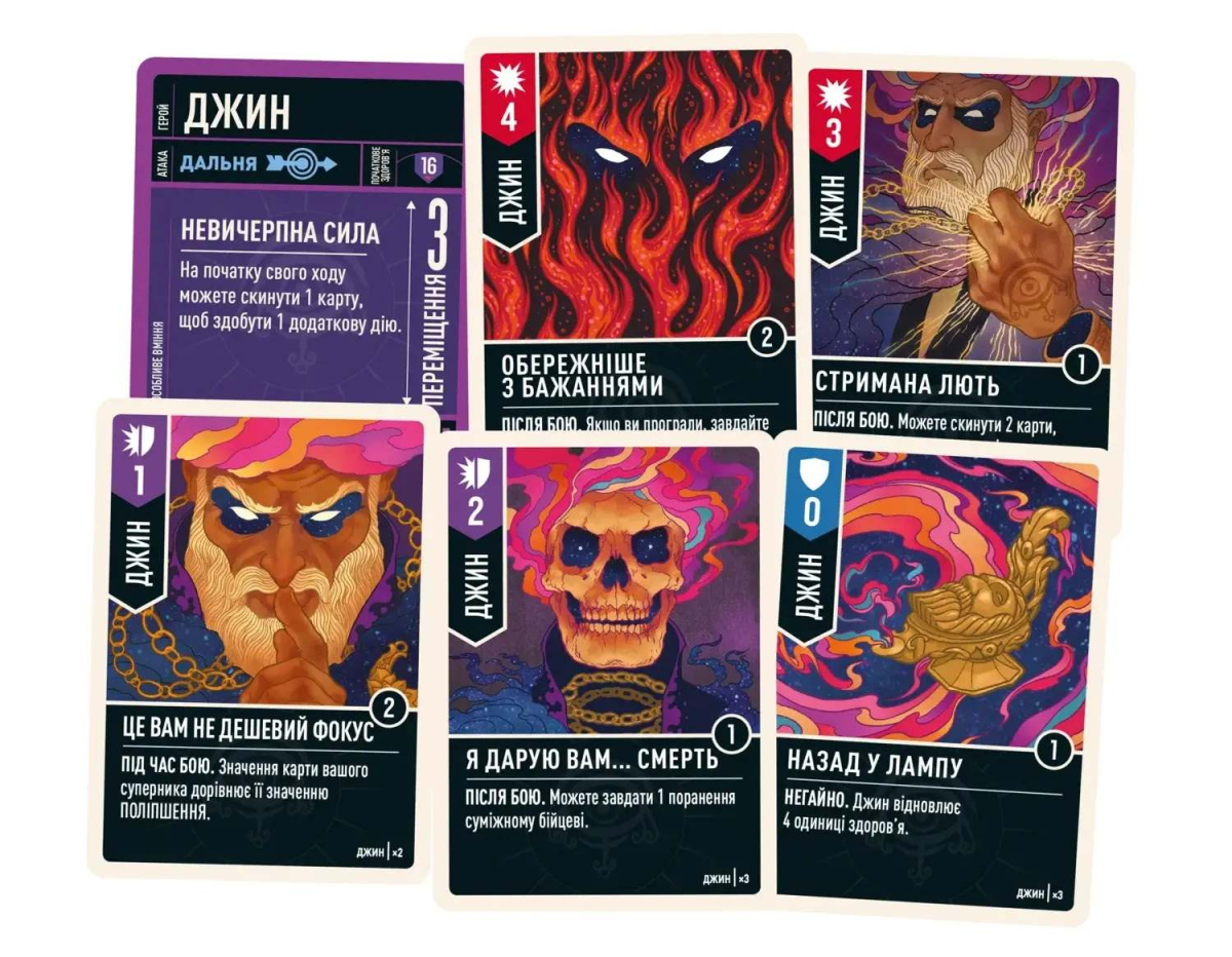 Открыв коробку, вы найдете не только фигурки и колоды карт героев Гарри Гудини и Джинна Лампы, но и фишку прекрасной Бесс, помощницы выдающегося фокусника, которая вместе с ним будет вступать в бой. Также особенностью героя Гудини является то, что при выполнении маневра и улучшения, игроки могут вместо привычного перемещения разместить Гарри на любой ячейке.Относительно возможностей Джинна – его магия позволяет в начале хода сбросить 1 карту и за это получить дополнительное действие.