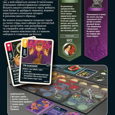 Очередной самостоятельный выпуск в серии дуэльных карточных игр Unmatched – Гудини против Джинна предназначена для расширения вашей коллекции героев и новых возможностей.