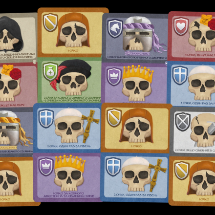 Игра содержит 36 карт (18 из базовой игры и 18 из дополнений), на каждой из которых изображено по 2 черепа, это может быть: защитники, купцы, фанатики, дворяне, крестьяне, священники, любовники и/или преступники. В течение игры игроки выкладывают карты в фигуру формы пирамиды. В конце партии они получают очки за определенные смежные черепа в своих пирамидах, согласно последнему желанию умершего.