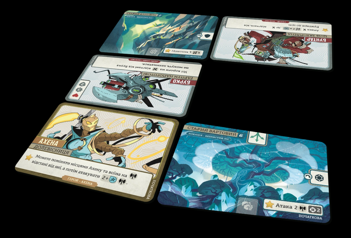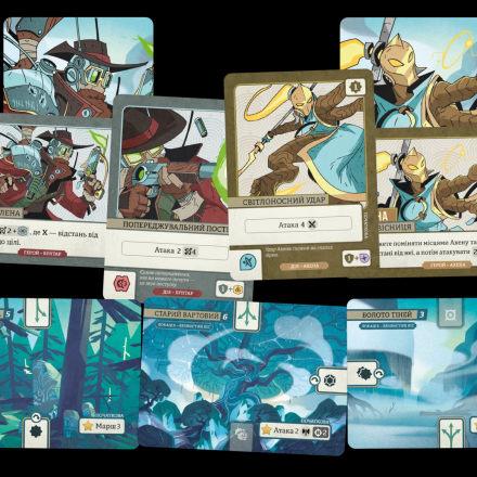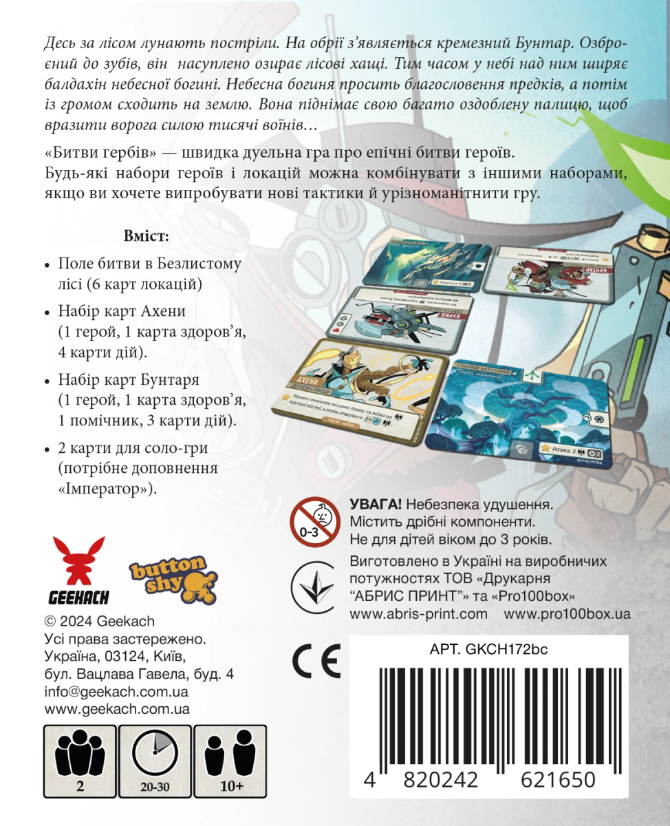 Набор “Битви гербів: Безлистий ліс” открывает серию минималистичных игр в жанре скирмиш, где участникам предстоит бороться за звание величайшего героя. Базовая игра содержит карты персонажей и карты местности. С помощью дополнений вы сможете открыть для себя новых героев.