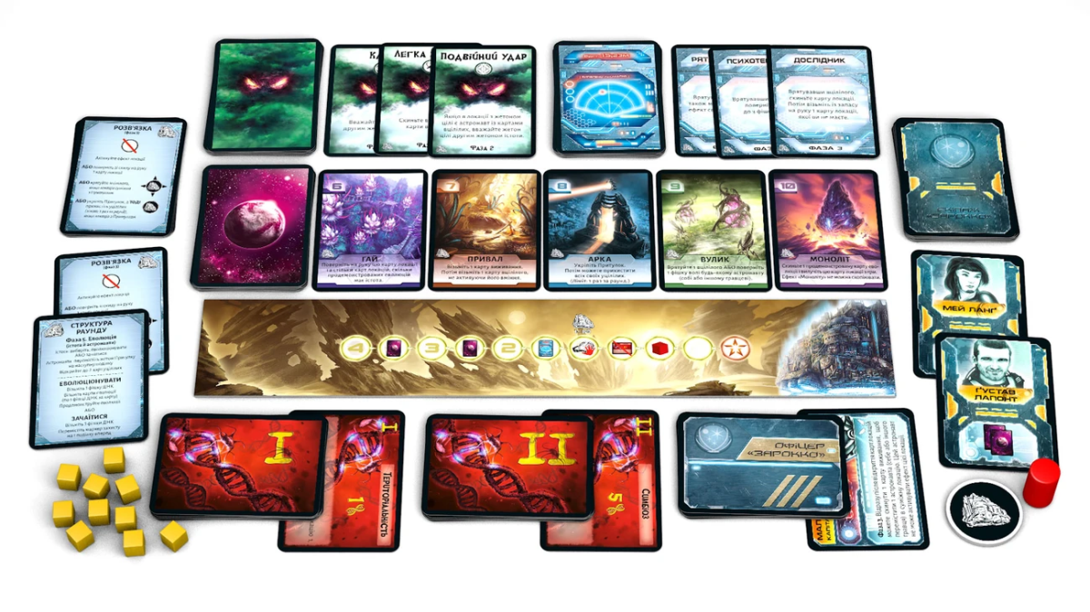 - Адаптации и фишки ДНК. Карты уникальных способностей существа. С помощью фишек ДНК существо развивает свои способности.