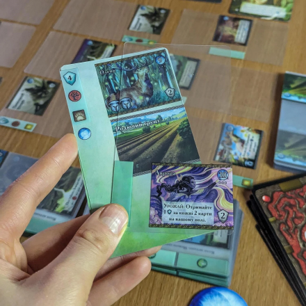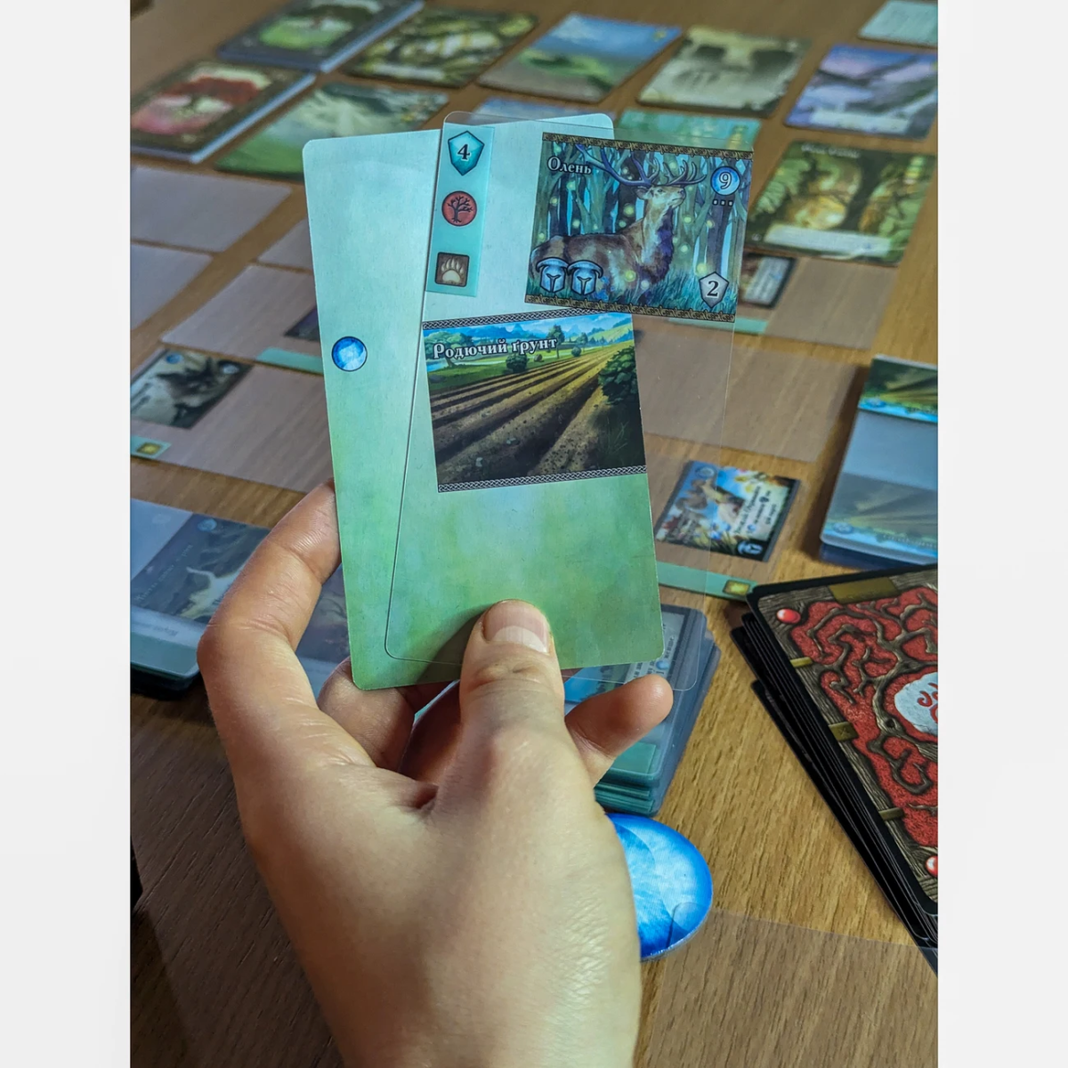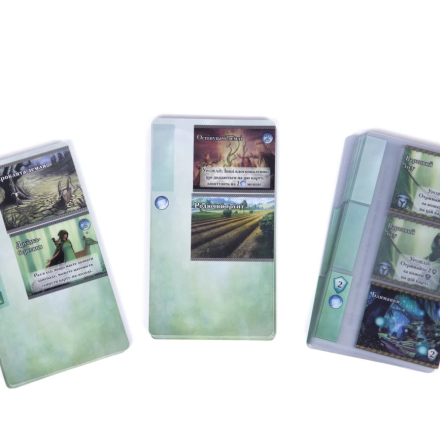 Каждая карта помещается в прозрачный протектор с иллюстрацией, которая закрывает лишь третью часть карты.