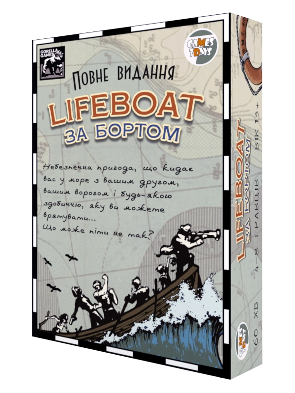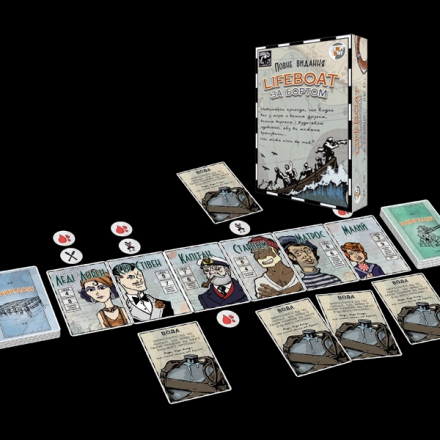 Настольная игра «Lifeboat» – психологическая компанейская игра с поразительно глубоким геймплеем. Корабль затонул, и только небольшой группе счастливчиков удалось спастись, попав на единственную шлюпку. Капитан, Старпом, Сэр Стивен, Леди Лейн, Матрос и Малыш. Сейчас они дрейфуют в открытом море в надежде увидеть землю. Припасы заканчиваются, солнце курит беспощадно, всех мучает жажда. Неудивительно, что вскоре начинаются подлости, интриги и драки.