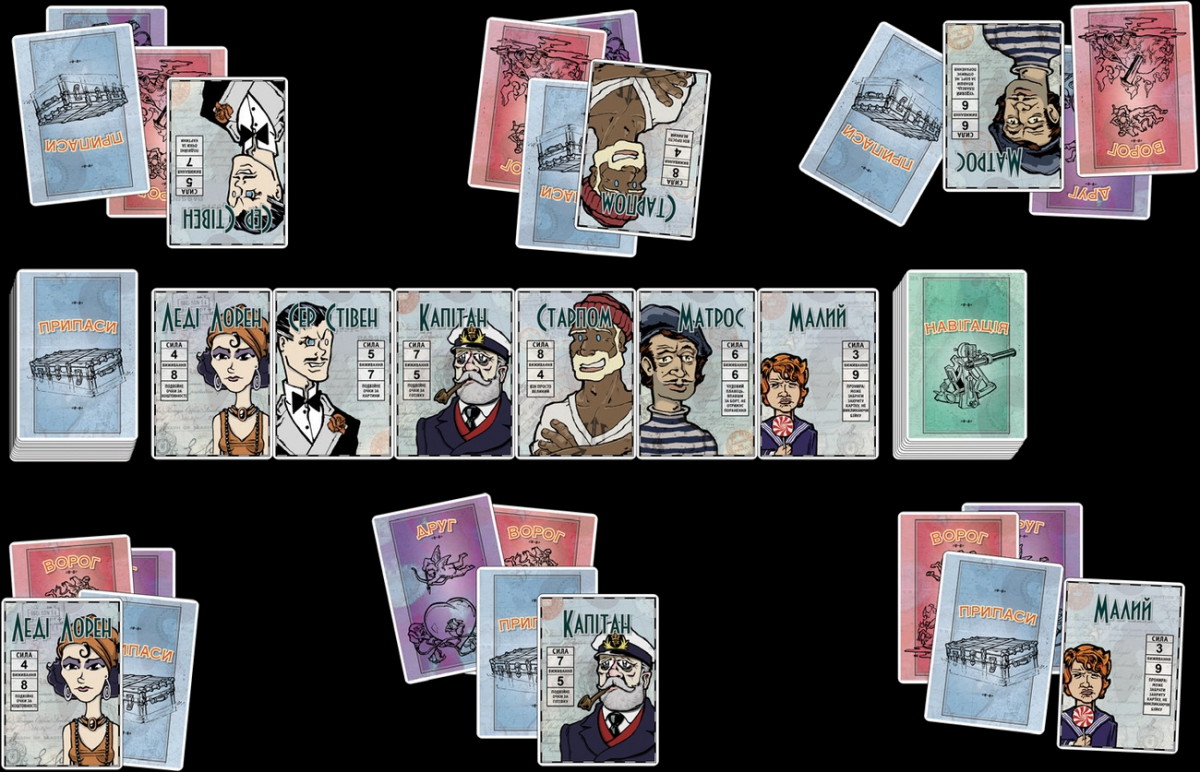 - Утро. Распределение припасов. В игре наибольший вес имеет расположение карт на лодке: чем ближе вы к корме, тем раньше получаете карты припасов. Сначала последовательность персонажей на лодке определяют их роли, а затем в ходе игры вы сможете поменяться местами с другими героями.