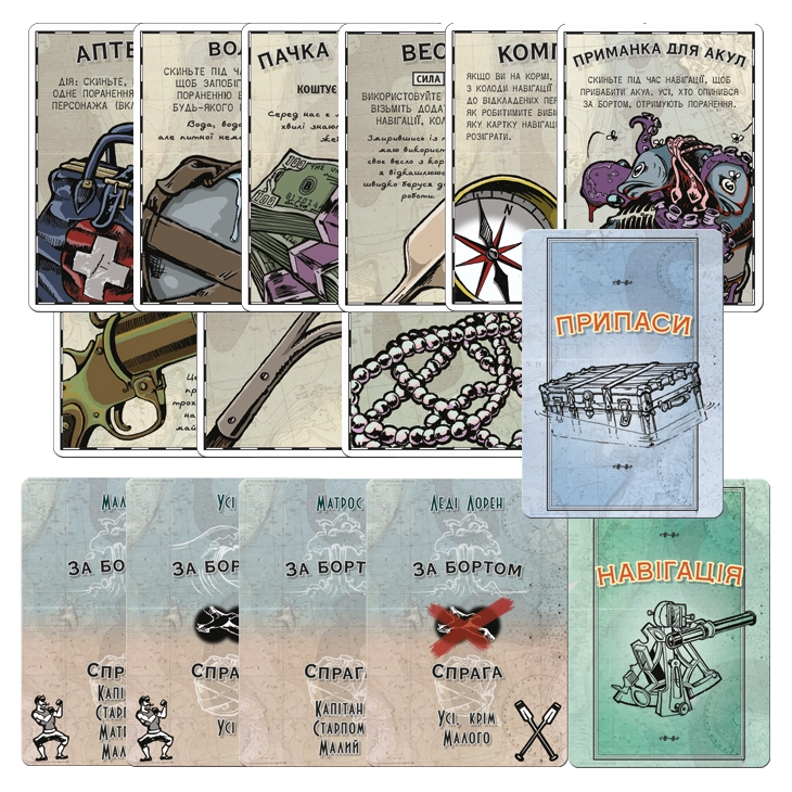 Активный игрок может взять весла в руки и немного погребсти, отдохнуть, поменяться местами с другим игроком, попытаться кого-то ограбить или выполнить специальное действие - воспользоваться сигнальным пистолетом, зонтиком или аптечкой. Вы можете даже подраться с другими участниками, если хотите избавиться от врагов. - Вечер. Навигация. Персонаж на носу берет одну из карт навигации из колоды. Если на ней есть изображение чайки, игрок выкладывает соответствующий маркер. Перечеркнутая чайка убирает имеющийся маркер. В этой фазе также определяется, кто из персонажей будет страдать от жажды или выпадет за борт. Если вы выпали за борт, сразу получаете один жетон ранения, да еще и другие персонажи могут с тем помочь, если применят акул. Если вы в конце раунда не утолите жажду водой, то также получите ранение.