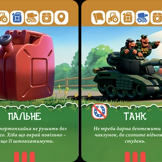 В начале партии все нужные карты перемешиваются и каждый участник получает по 3 из общей колоды. Цель игры: выложить перед собой сет из 6 сюжетных карт: флаг, трактор, топливо, танк, стиральная машина, карта.