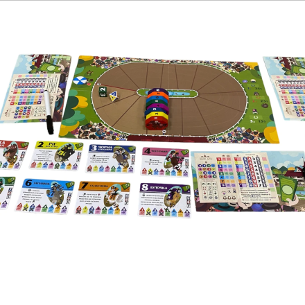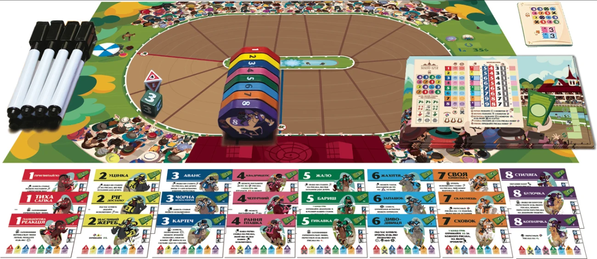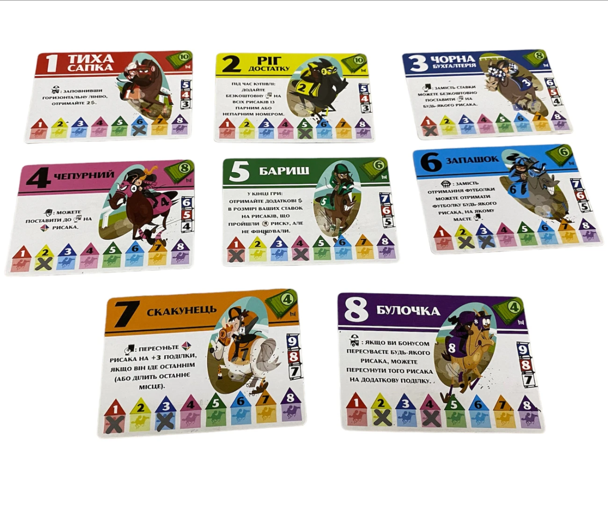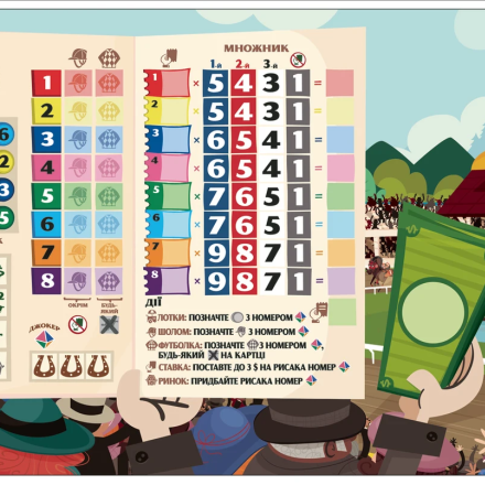 - Раздайте игрокам планшеты и маркеры, а также по одной случайной стартовой карте. Игроки должны зачеркнуть четыре числа с этой карты в зоне торгового лотка на своем планшете, а также отметить две ставки в ячейках указанных на карте лошадей. Также отметьте стартовый капитал в 12 единиц на планшетах.