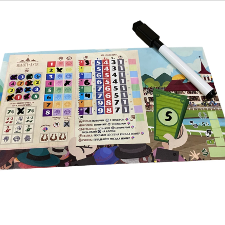 - Торговля. Следует зачеркнуть кружочек с числом лошадки, выброшенной игроком этого раунда, в зоне палатки на своем планшете. Как только вы завершите ряд или столбик в зоне лотка, вы сможете воспользоваться одним из бонусов торговли, указанных сразу под зоной. Воспользовавшись бонусом, вычеркните его: они одноразовые.