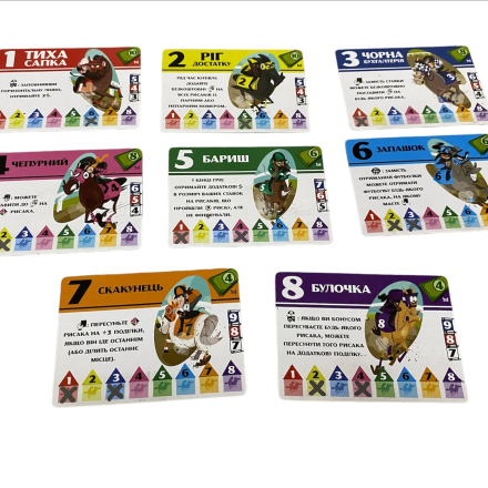 - Для каждого скакуна выберите карту, участвующую в партии. Разместите эти карты у трека, который образует "Рынок". Для первой игры есть отдельный набор, обозначенный символом яблоневого огрызка.