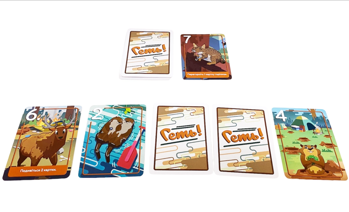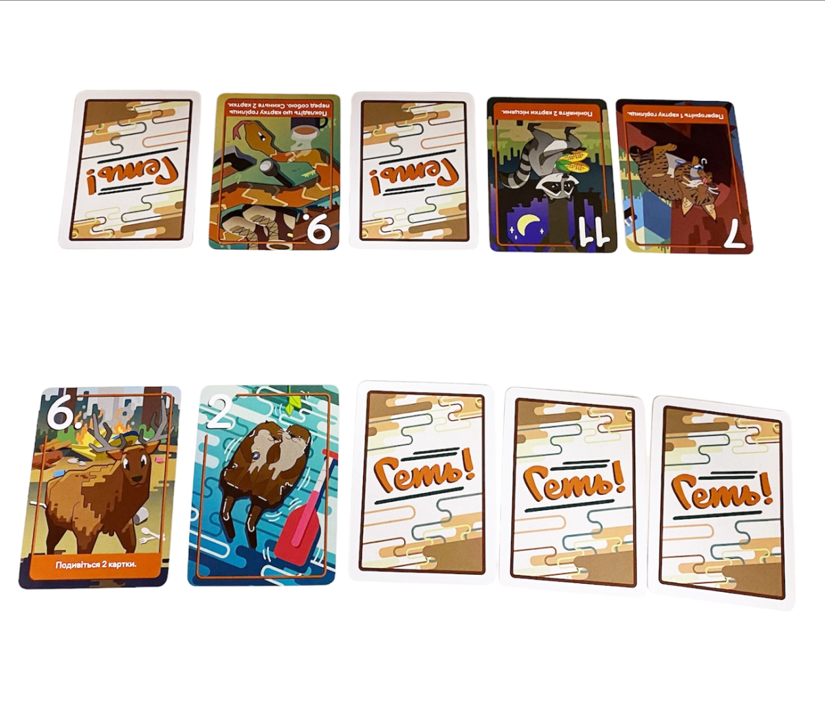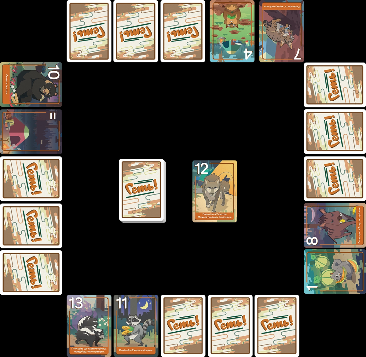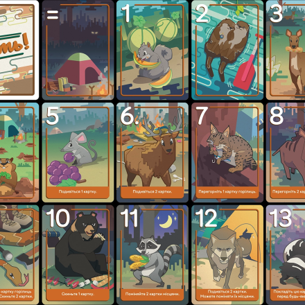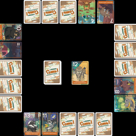 Также игра завершается когда пустеет колода. Открыв все свои карты и подсчитав общую сумму команды, запишите результат. Игра длится 4 раунда с 4 туристами, или 3 раунда с шестью или тремя туристами.